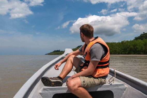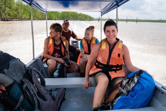 Die Landschaft zieht vorbei, erst kleine Holzhütten der Einwohner, dann weite Mangrovenwälder. Als wir uns dem Meer nähern, wird es plötzlich wellig und Wasser schwappt uns entgegen, als wir mit Vollgas durch die Wellenfront fahren. Die Sonne brennt vom Himmel, um uns herum ist herrliche Natur und der endlos weite Blick zum Meer. Rechts von uns erheben sich bewaldete Felsklippen. Es ist atemberaubend schön! Wir sind überglücklich, denn schon jetzt hat sich der Ausflug aus unserer Sicht gelohnt.