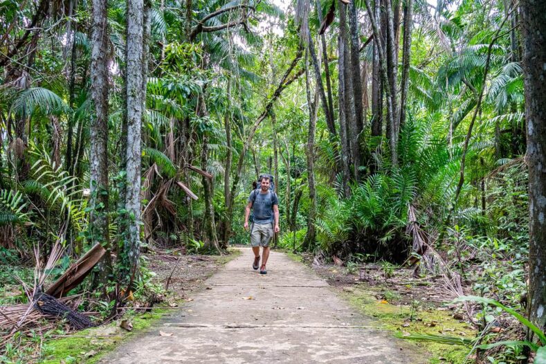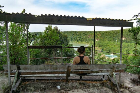 Habt ihr schon mal eine Nacht im Dschungel verbracht? Wir schon und daher freuen wir uns auf den Abend. Aber vorher packen wir aus, lassen uns eine Karte mit den Wanderwegen im Park geben und machen uns auf den Weg, den ersten Trail entlang. Er nennt sich Trail Nr. 1, ist nur 400 Meter lang und super für den Einstieg – dachten wir zumindest. Dass er eine halbe Stunde steil bergauf führt, bei Saunatemperaturen war uns nicht bewusst. Und so klettern wir schnaufend und schwitzend, Felsen um Felsen und bis wir die Spitze erreicht haben. Gut, wenn man vorher weiß, dass der Weg beständig bergauf geht, ist er wahrscheinlich gar nicht so schlimm. Aber dafür, dass wir uns nur mal kurz die Beine vertreten wollten, ist er doch etwas anstrengend.