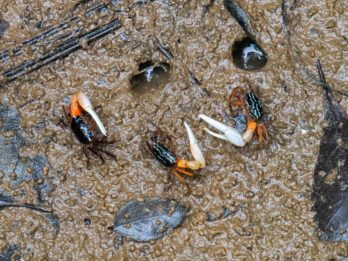 Schnell tragen wir unsere Sachen vom Boot und steigen aus. Hier stehen wir nun, an einer kleinen Flussmündung zum Meer, umgeben von Mangroven und dem beginnenden Regenwald. Es ist schwül und heiß und um uns herum die Geräusche des Dschungels. Winzige Krebse, Winkerkrabben mit einer riesigen Schere auf einer Seite, laufen im Matsch umher. Ein Schild weist den Weg Richtung Headquarter – das kann ja so verkehrt nicht sein!