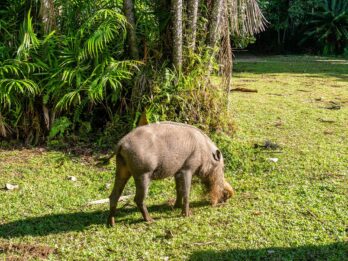 Also marschieren wir los. Es geht über Holzplanken an kleinen Jungle Lodges vorbei und plötzlich stehen wir vor dem ersten richtigen Bewohner des Parks – einem Bartschwein. Es gräbt gerade die Wiese unter sich um auf der Suche nach Essbarem und schaut uns mit seinen hellen Augen neugierig an. Bartschweine sind eine gefährdete Tierart, leben rund um das Hauptquartier und sind an die wechselnden Besucher im Park gewöhnt.