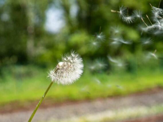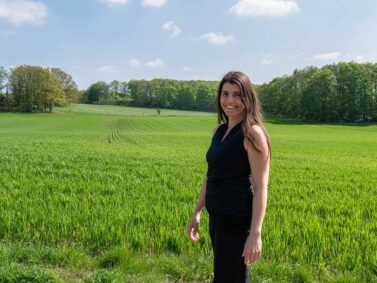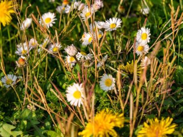 Zum Glück haben alle schon gegessen. Vom Parkplatz des Waldes treten wir hinaus auf das Feld mit Blick auf den rekonstruierten Förderturm und das Maschinenhaus. Hier findet sich am Waldrand ein kleiner Rastplatz mit Bänken und Blick über die Felder. Die Nachmittagssonne taucht alles in ein hübsches Licht und kleine Gänseblümchen blühen rings um den Förderturm.