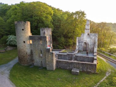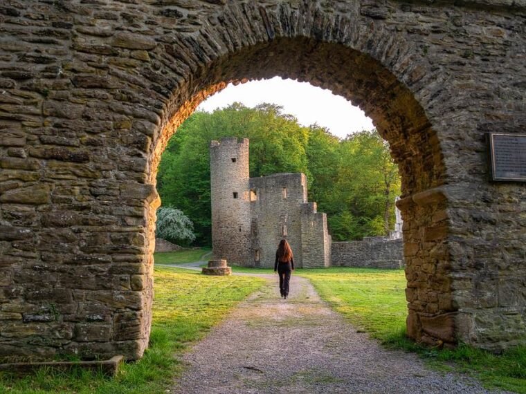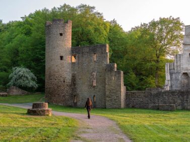 Wir treten durch die Toranlage der breiten Umfassungsmauer und laufen über die Grasfläche auf die Ruine zu. Dies hier ist Geschichte zum Anfassen. Zwei Rundtürme ragen beeindruckend in den Himmel. Noch heute kannst du Teile der Saalkammer, den Grundriss der Kellerräume und einen Kamin sehen. Wir wandern zwischen den Mauern umher und halten mit Blick auf die malerische Ruhr inne.