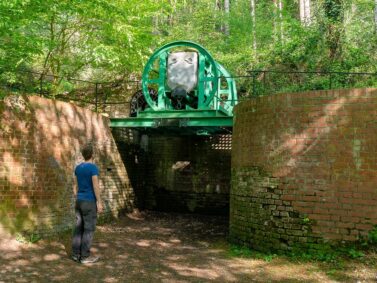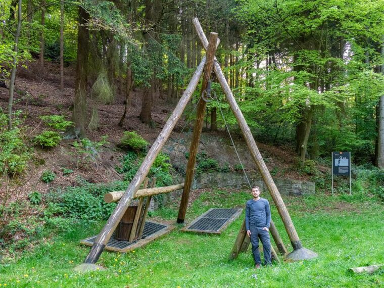 Nach einem kurzen Marsch durch den Wald erreichen wir die Zeche Renate und kurz danach einen Dreibaum, der zum Heben von Lasten benutzt wurde. Da es bereits sehr spät ist und wir noch ein gutes Stück des Wegs zurücklegen müssen, entscheiden wir uns, eine Abkürzung zu nehmen und das Göpelhaus sowie die Göpelschächte auszulassen. Wir haben uns doch etwas mit der Länge der Wanderung verschätzt. Und da wir länger nicht Wandern waren, merken wir mittlerweile auch unsere Beine.