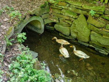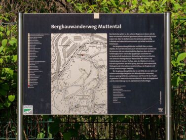 Mittlerweile ist die Straße unter unseren Füßen einem Waldweg gewichen. Wir laufen durch die hohen Bäume und hangeln uns von Informationstafel zu Informationstafel. Zum Glück haben wir eine Karte des Bergbauwanderwegs aus dem Museum der Zeche Nachtigall mitgenommen, sodass wir uns leicht zurechtfinden. Spaziergänger mit Hunden laufen an uns vorbei und wir entdecken Mäuse und Vögel im Unterholz sitzen. Verträumt liegt eine Wiese mit Wildblumen neben uns und der kleine Muttenbach schlängelt sich malerisch hindurch.