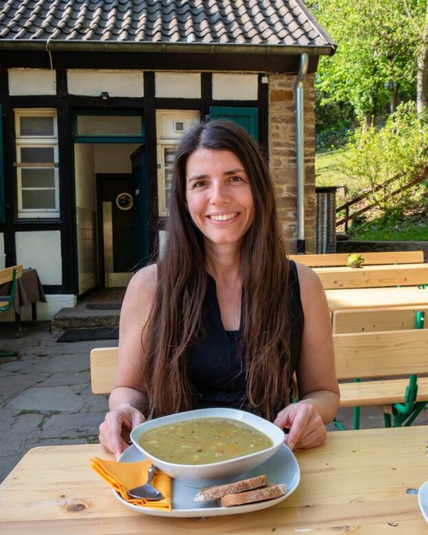 Wir stehen vor dem Bethaus und werden von dem Schmied und Gastwirt mit einem herzlichen „Glück auf!“, begrüßt, dem alten Gruß der Bergleute. Er erklärt uns, dass wir uns alles anschauen und auch etwas im Gasthaus essen können. Das lassen wir uns nicht zweimal sagen. Zunächst besichtigen wir die kleine Schmiede, in der Informationstafeln aushängen und auch Vorführungen gemacht werden. Anschließend setzen wir uns auf die sonnige Terrasse der Wirtsstube. Eine Erbsensuppe später sind wir rundum zufrieden und wieder gestärkt für die weitere Wanderung.