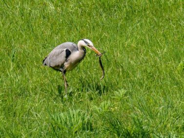 Plötzlich schnellt er nach vorne und pickt mit seinem Schnabel eine große Blindschleiche von der Wiese. Mit gemischten Gefühlen sehen wir zu, wie der Reiher in einiger Entfernung die zappelnde Echse einfach hinunterschluckt. Wir lassen den Reiher zurück und wenig später taucht die Zeche Nachtigall vor uns auf. Hier befindet sich die Endstation der Muttenthalbahn. Auch die Anlegestelle der MS Schwalbe II ist nicht weit entfernt.