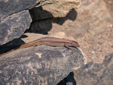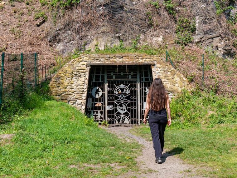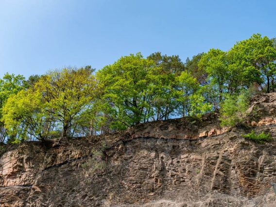An der beeindruckenden Felswand kannst du ein Kohleflöz sehen. Hier ist auch das Mundloch des Besucherbergwerks Nachtigallstollen zu sehen, von dem aus du in den langen Stollen hineinschauen kannst. Wir hätten nun doch gerne eine Führung unter Tage mitgemacht, jetzt als uns die kühle Luft aus dem Berginneren entgegenschlägt. Vor dem Stolleneingang setzen wir uns in die Sonne und schauen den kleinen Eidechsen zu, die sich zwischen dem Laub tummeln.