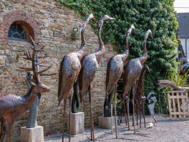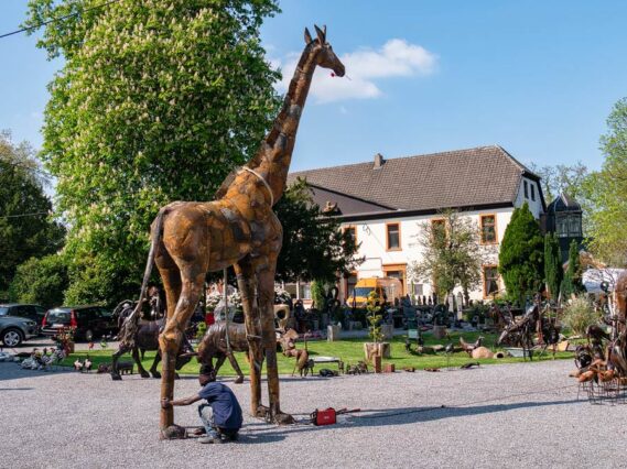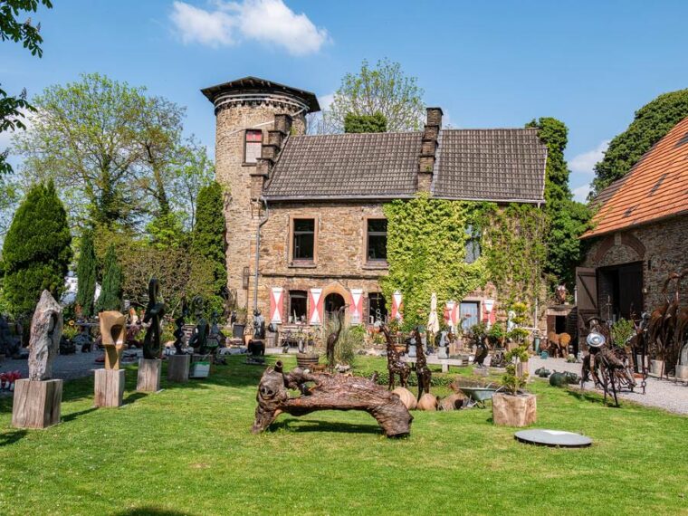 Am Schloss angekommen, sehen wir zuerst die Skulpturen links neben uns. Hier gibt es einen Skulpturenpark, der sich in einem Garten zwischen dichten Bäumen befindet. Ein paar Meter weiter bleiben wir jedoch staunend stehen. Denn direkt vor dem alten Schloss stehen Hunderte von Skulpturen und Figuren in einem kleinen Garten. Bunt und modern aus altem Eisen, Blechen und Stein ziehen sie uns in ihren Bann.
