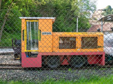 Gertrud ist ihr Name und sie ist eine alte, orange Feldbahnlok, die mit ihren Personenwagen Besucher vom Parkplatz zum Gruben- und Feldbahnmuseum Zeche Theresia und weiter zur Zeche Nachtigall bringt. Die Gleise liegen parallel zu denen der Ruhrtalbahn und passieren den alten Güterbahnhof Witten Bommern. Die Strecke, die die nostalgische Bahn fährt, ist nur kurz. Heute hat die alte Dame leider Ruhetag, daher beschließen wir, zu Fuß zu laufen.