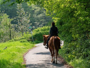 Unterwegs werden wir von einem Pferd überholt. Das Klackern der Hufe hat etwas Beruhigendes. Die Wärme auf unserer Haut tut ihr Übriges. Bald sind wir wieder am Bergbauweg angekommen und das nächste Mundloch eines Zechenstollens lässt nicht lange auf sich warten.