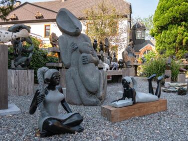 Dahinter das alte Steingebäude des Schlosses mit seinem schönen Turm. Ein herrlicher Anblick. In dem kleinen Laden des Schlosses erfahren wir, dass es sich um Shona-Kunst handelt, Kunst aus Simbabwe, die hier verkauft wird. Passend dazu arbeitet ein afrikanischer Bildhauer draußen im Garten an einer riesigen Giraffe.