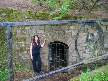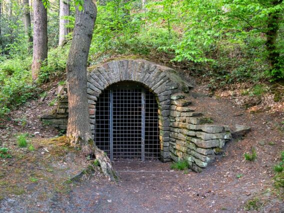 Wir laufen weiter, die Wiese zu unserer Rechten und der Wald mit Vogelgezwitscher zu unserer Linken. Weitere Pferde tauchen auf dem Weg vor uns auf, denn hier im Wald gibt es auch Reitwege. Wir passieren die Verladeanlage der Zeche Jupiter und mehrere Stollen, darunter der Stollen Stettin, die Stollenzeche Maximus und den Stollen Fortuna. Jeder Stolleneingang sieht einzigartig aus und ist sehenswert. Alle sind mit einem Gitter verschlossen und viele im Innern nach ein bis zwei Metern zugemauert.