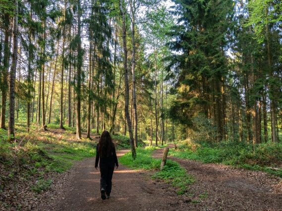 Von hier aus führt uns der Weg weiter die Straße entlang und kurz darauf zu einer Abbiegung, an der weidende, schottische Hochlandrinder hinter einem Zaun stehen. Die zotteligen Rinder werfen uns neugierige Blicke zu, während wir vorbeigehen. Kurze Zeit später stehen wir wieder in einem wunderschönen Waldstück. Hier führt der Weg abwärts zur Ruhr. Allerdings welcher? An einer Gabelung bleiben wir stehen und wären fast falsch gelaufen.