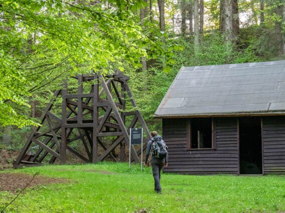 Dann führt uns der Weg weiter zu einer alten Haspelanlage. Die kleine Hütte steht unscheinbar am Wegesrand. Wozu sie gut ist, erfahren wir erst, nachdem wir uns die Information dazu durchlesen. Hier wurde Kohle an einem Förderseil aus dem darunter liegenden Schacht nach oben transportiert. Über eine Seilwinde wurden hier bis zu 120 kg Kohle je Fördergefäß in die Höhe gezogen. Wir blicken uns um. So idyllisch wie es hier um uns herum ist, umso beeindruckender ist, was sich unter unseren Füßen abgespielt haben muss.
