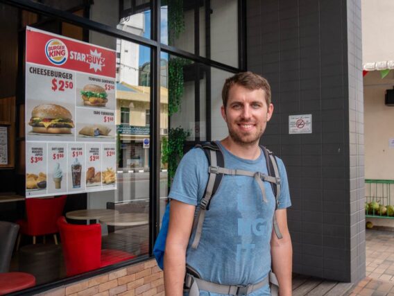 Ich bleibe mit unserem Gepäck in der Sonne stehen, während Steffen sich auf die Suche nach einem Café mit kostenlosem WLAN macht. Ein paar Minuten später kommt er wieder zurück und wir laufen mit unseren Sachen zum nahe gelegenen Burger King. Wir bestellen eine Kleinigkeit zu essen und können das WLAN nutzen. Nun können wir die Bruneikarte für Maps.Me herunterladen und orientieren uns.