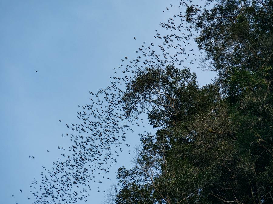 In Gruppen starten die Fledermäuse in die Dämmerung