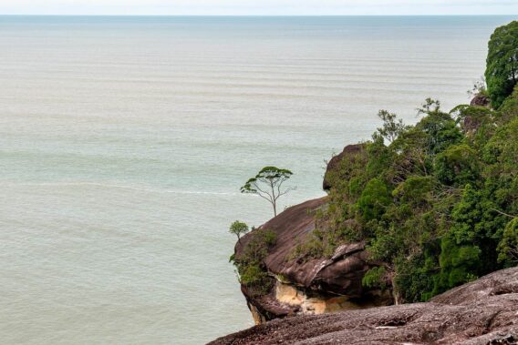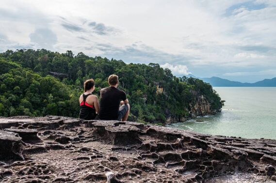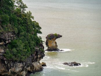 Im Wasser können wir in einiger Entfernung den Kobrafelsen sehen. Er ist das Wahrzeichen des Bako Nationalparks und nennt sich so, da die Form an eine Kobra erinnert. Vom Strand selbst ist er nicht zu sehen, nur hier von dieser Klippe. Wir setzen unsere Rucksäcke ab und machen es uns auf dem Felsen gemütlich. So schön ist es, dass wir beschließen, erst einmal hier zu bleiben. Wir schauen in die Ferne, reden über dies und das und freuen uns über die bezaubernde Natur um uns herum. Hätte mir früher jemand gesagt, dass mich die Natur so begeistern könnte, hätte ich ihn für verrückt gehalten. Heutzutage könnte ich Stunden in ihr verbringen und mich über all die vielen Eindrücke freuen.