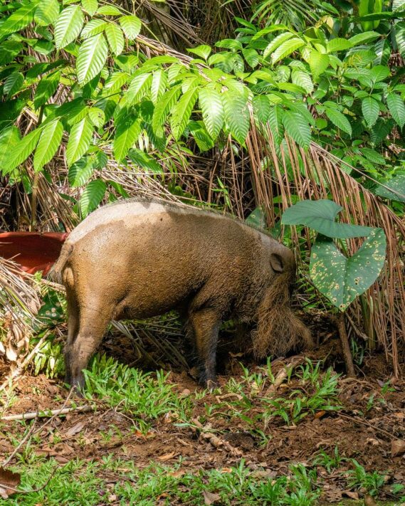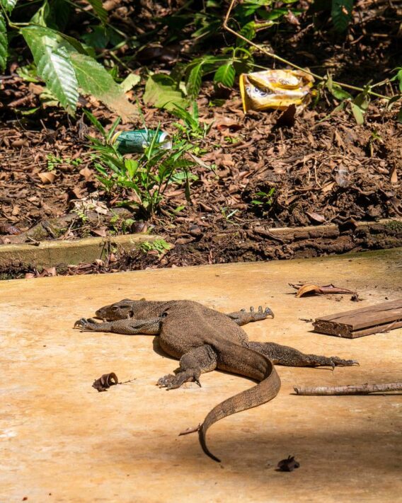 Wie schön ist es bitte, morgens im Regenwald aufzuwachen? Im Sonnenschein? Mit tausend Urwaldgeräuschen um sich herum! Ich blinzle zu Steffen hinüber, der noch selig schlummert. „Heute wird ein guter Tag“, lächele ich still in mich hinein, bevor ich Steffen wecke. Steffen macht die Augen auf und wir müssen beide lachen, liegen wir doch in zwei etwas durchgelegenen, wackeligen Betten, von denen eins etwas Schlagseite hat. Halt typisch Regenwaldabenteuer. Vor unserem Fenster gräbt ein Bartschwein gerade den Rasen um, während neben unserer Hütte ein die Sonne anbetender Waran noch sein morgendliches Sonnenbad nimmt.