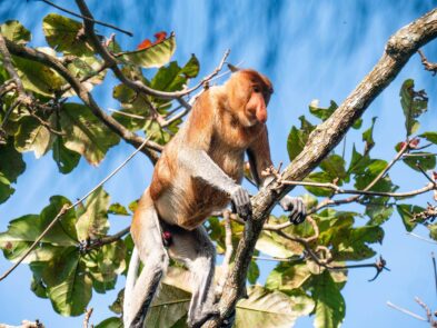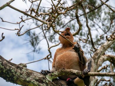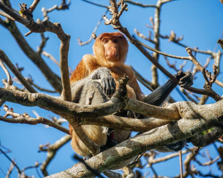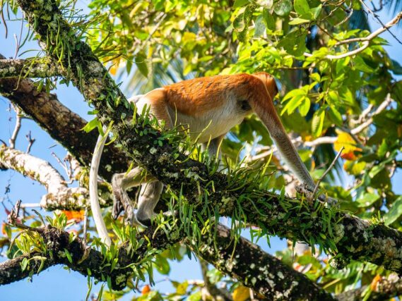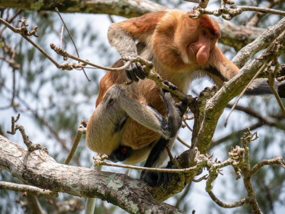 Wir schmieden Pläne für den Tag, überlegen, welche Wege wir wandern wollen, ob wir alles eingepackt haben, wie viel Wasser wir für den Tag benötigen und plötzlich sind sie da … Nasenaffen! Direkt vor uns in den Bäumen. Mit langen Beinen und dicken Bäuchen hangeln sie sich durch die Äste. Man erkennt sie sofort mit ihrer riesigen Nase, die wie ein dicker Beutel herunterhängt. Die Weibchen haben kleine, süße Stupsnasen. Aber die Männchen übertreffen sich mit der Größe ihrer auffälligen Nase. Überall zupfen sie kleine Knospen und Triebe von den Bäumen, um sich dann zum nächsten Ast zu hangeln.