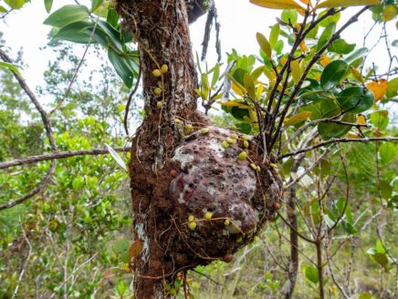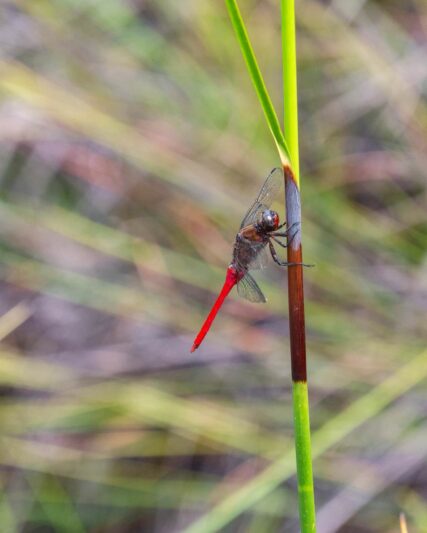 Es sieht wunderschön aus, ein bisschen mediterran, mit kleinen Bäumen und großen Büschen, sehr trocken. Wir kommen an einem Termitenbau vorbei und halten schließlich an einem schmalen Holzweg. Dieser führt direkt in eine riesige Graslandschaft hinein. Ab hier gibt es keine Bäume mehr, eher graugrüne Sträucher. Steffen läuft bereits den Weg entlang, als ich ihn zurückrufe. Ich habe gerade die Entdeckung des Jahrhunderts gemacht! Jedenfalls für mich. Am Wegesrand habe ich sie gefunden. Eine minikleine Kannenpflanze!