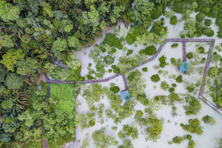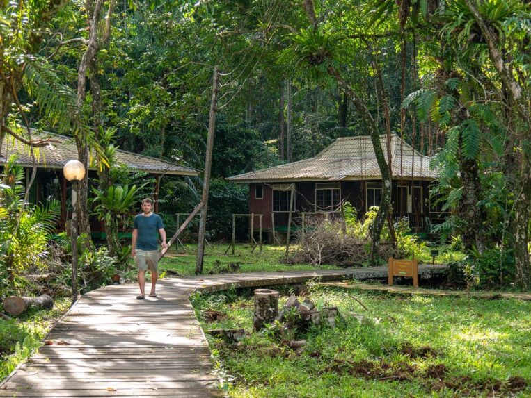 Wir tragen uns im Hauptgebäude für drei der Wanderwege ein und gehen zurück zu unserer Lodge, um unsere Rucksäcke* zu holen. Nicht, dass wir unbedingt drei Wege an einem Tag laufen würden, aber man weiß ja nie. Gesagt getan, nehmen wir unsere Rucksäcke und sind schon mitten auf dem Weg in den Regenwald. Wir gehen vorbei am Bootsanleger, über einen Plankenweg durch die Mangroven, die jetzt bei Flut komplett im Meer stehen, bis wir über den kleinen Weg direkt in den Wald kommen. Die Wege sind gut ausgeschildert. Weg Nummer 6 ist unsere Wahl, er ist mit am beliebtesten. Und so marschieren wir, dem Hinweisschild folgend, in den Regenwald hinein.