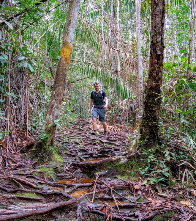Der Weg endet irgendwann. Viele Fotos später und nach einer erneuten Trinkpause, folgen wir dem Pfad, der nun immer weiter bergab führt. Vorbei an Gras- und Buschlandschaften, kleinen Bäumen und lehmigem Boden mit Wasserpfützen. Irgendwann geht es wieder in den Regenwald hinein und wir klettern Wurzel um Wurzel immer tiefer hinab. Wasser sammelt sich zwischen den natürlichen Stufen und so ist es gar nicht so einfach, den Weg hinunter zu kommen.