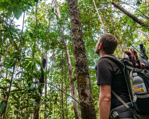 Es ist brütend heiß und die Luftfeuchtigkeit extrem hoch, obwohl es noch Morgen ist. Wir schwitzen schon, seitdem wir den Wald betreten haben und schnell sind unsere Klamotten durchweicht. Auf einem Weg voller Wurzeln bewegen wir uns immer weiter durch den Regenwald. Es geht bergauf und irgendwann ändert sich die Vegetation, der Boden wird sandiger, der Wald weniger dicht und die Bäume kleiner. Wir machen eine kleine Pause und trinken unser Wasser, bevor es weitergeht. Die erste Flasche Wasser ist schnell geleert, und durch die Hitze und die körperliche Anstrengung benötigen wir um einiges mehr an Flüssigkeit als normal. Wir gehen weiter und sind auf einer Art Plateau zwischen den Bäumen angekommen. Von nun an geht es nicht mehr bergauf, sondern nur noch gerade aus.