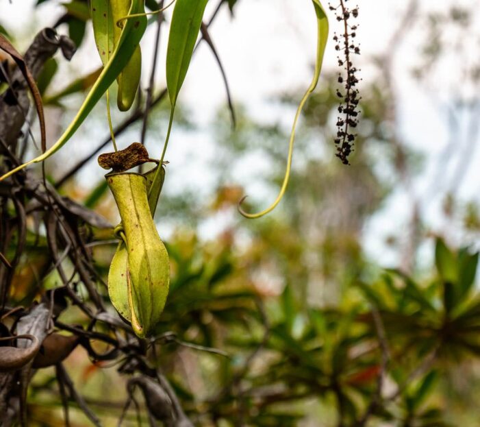 Für jeden, der sich jetzt fragt, was zum Teufel eine Kannenpflanze ist: eine Kannenpflanze ist eine fleischfressende Pflanze, die einen schlauchartigen Hohlraum besitzt und ihre Beute – z. B. kleine Insekten – mit einem Duftstoff anlockt. Fliegen die armen Insekten hinein, werden sie von der Pflanze verdaut. Etwas grausam, aber toll sehen sie aus. Steffen zückt die Kamera und so wird die kleine Pflanze von allen Seiten fotografiert. Nun ja, ist ja auch unsere erste Kannenpflanze. Als wir dann den Weg weitergehen, entdecken wir immer mehr Kannenpflanzen. In allen möglichen Größen, von Grün bis Dunkelrot. Hätten wir das mal vorher gewusst.
