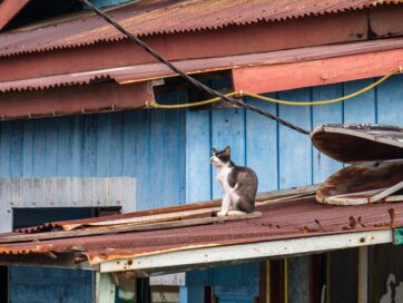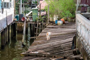 Der Blick in den unter uns liegenden Fluss ist auch nicht besser. Überall schwimmen Müll und Unrat. Auch die Häuser sind in keinem besseren Zustand. Waren die Häuser direkt neben dem Pier weitestgehend in Ordnung, werden sie immer maroder und abbruchreifer je weiter wir kommen. Teilweise passieren wir ganz zerfallene Hütten. Keine Menschenseele lässt sich blicken, nur die Katzen liegen entspannt im Schatten und ruhen sich aus.