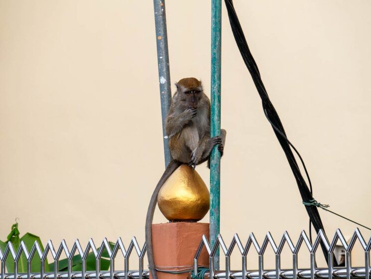 Wir sehen zwei Menschen als wir eine Brücke passieren. Unter uns fahren Boote vorbei, wir sind an einer kleinen Bootsstraße gelandet, die als Hauptverkehrsader durchs Dorf dient. Alle paar Minuten rauschen kleine Boote vorbei. Ansonsten ist noch immer alles verlassen. Erst als wir uns nach geraumer Zeit der Moschee des Wasserdorfes nähern, tauchen die ersten Menschen auf. Und Affen. Wir haben mittlerweile das Festland erreicht, ohne es zu merken. Hier neben der Moschee am Wasser hangeln sich die Affen an Dächern entlang, klettern über Zäune und laufen durch Gärten. Ein Highlight für uns, lieben wir es doch so sehr, Affen zuzuschauen.