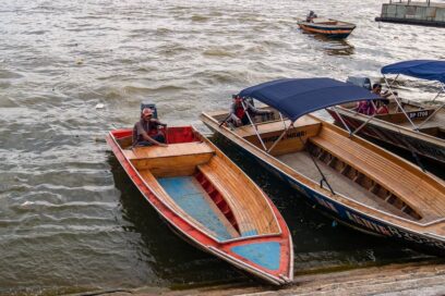 Wir haben doch eine relativ weite Strecke über die Stege zurückgelegt, sodass unsere Fahrt nun kurz dauert. Wir brausen zwischen den letzten Häusern hindurch und sehen schon den weiten Fluss vor uns auftauchen mit der moderneren Innenstadt auf der anderen Flussseite. Unser Fahrer fährt behutsam in einen kleinen Anleger ein, in dem schon seine Freunde mit ihren Booten liegen.