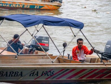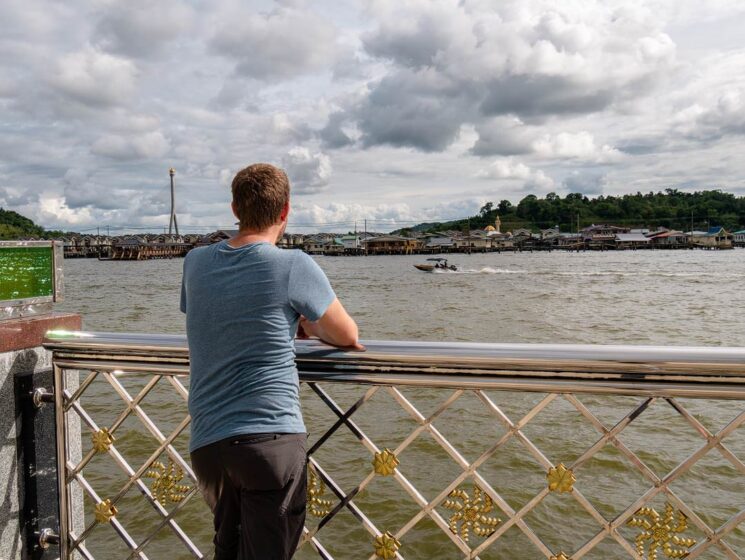 Die Bootsmänner, die mit ihren Wassertaxis auf dem Brunei River verkehren, haben uns schon am Tag zuvor angesprochen, als wir gerade an der Waterfront entlangschlenderten. Die Überfahrt ins Wasserdorf kostet nur einen Brunei Dollar pro Person. Und natürlich wollen wir uns das Wasserdorf nicht entgehen lassen. So stehen wir heute wieder am Wasser und halten Ausschau nach den kleinen Booten, die Passagiere ans andere Ufer bringen. Bei ihnen kann man übrigens auch Fahrten in die Mangroven zu den Nasenaffen buchen.