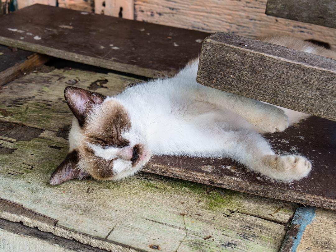 Eine cremefarbene Katze mit dunklem Gesicht liegt auf Holzbrettern und schläft.