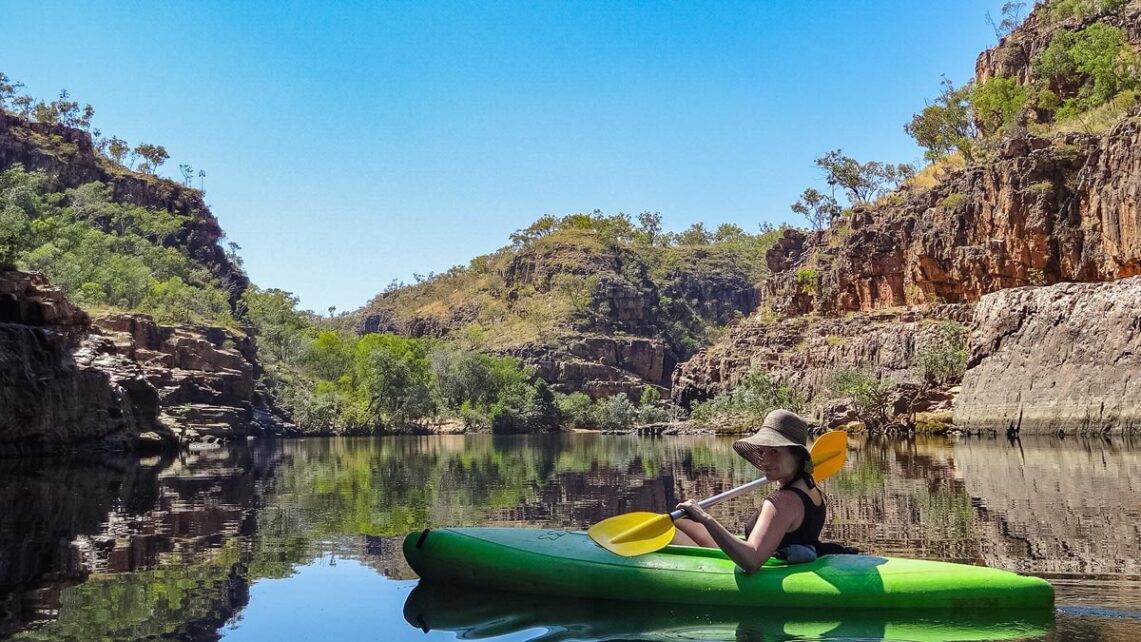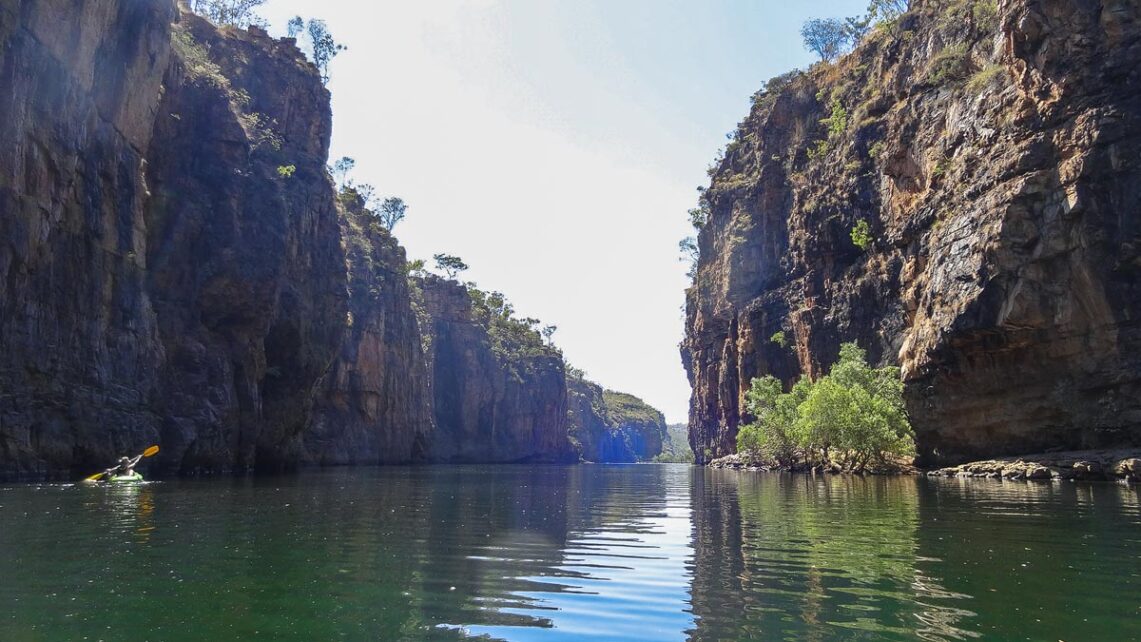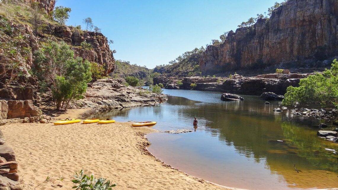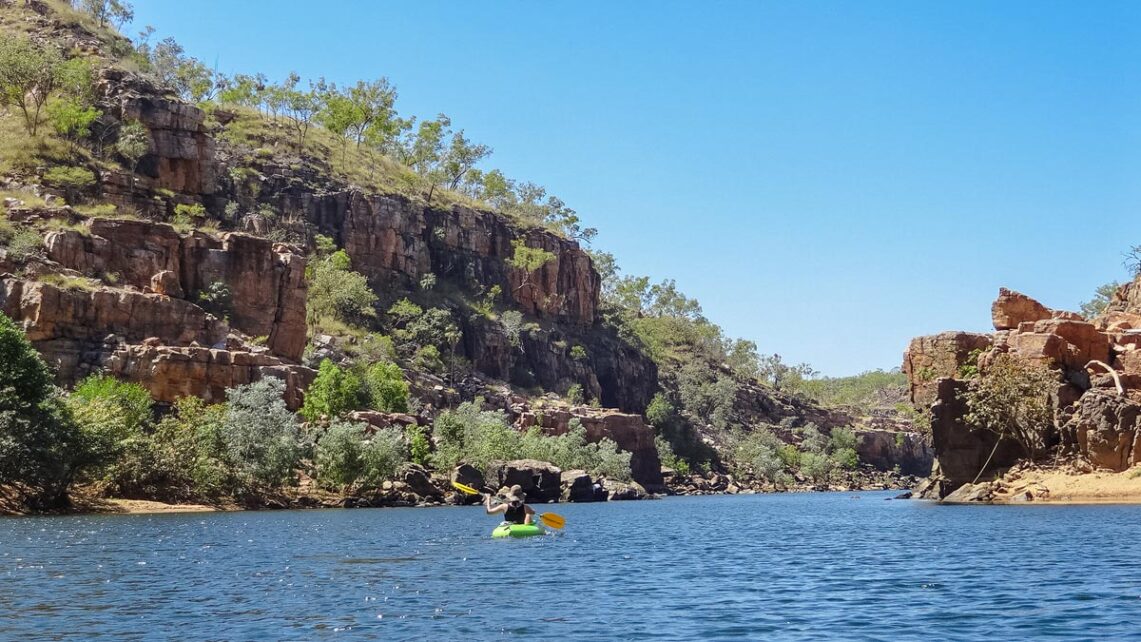 Wir rollen mit dem Camper die staubige Straße entlang und fahren auf den Parkplatz. Es ist heiß und die Sonne brennt vom Himmel. Wir steigen aus und sind geblendet von der Helligkeit und erschlagen von der sengenden Hitze. Und das am frühen Morgen. Wo müssen wir hin? Wir wissen nur so viel, hier ist der Nationalpark. In ihm soll es mehrere Schluchten geben, durch die der Katherine River fließt und auf denen Besucher Kajak fahren können.