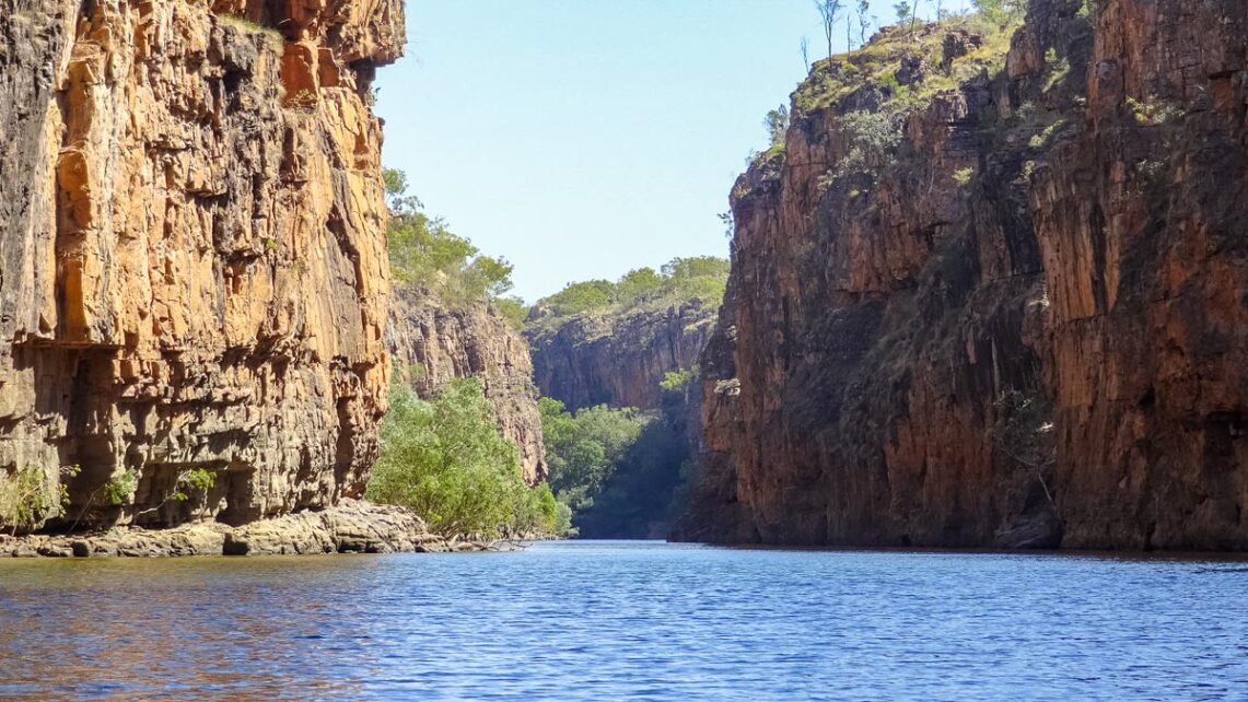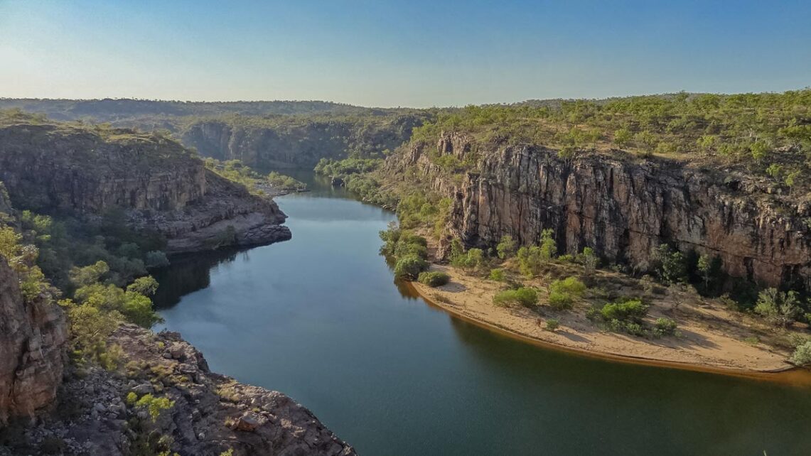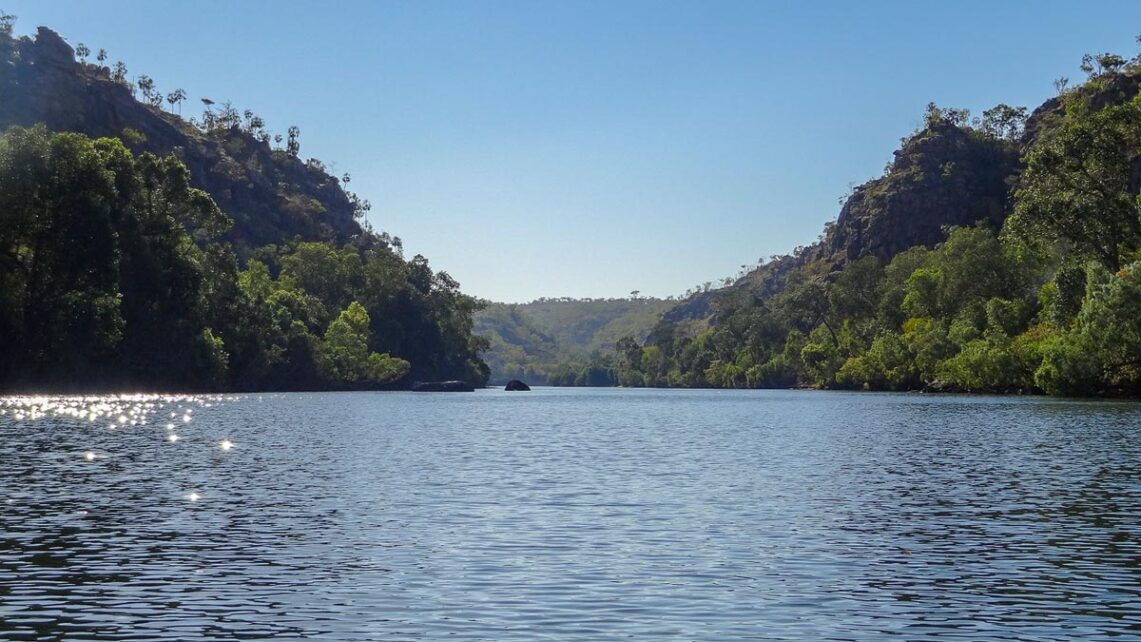 Durch den Katherine River hat sich über Jahrtausende eine tiefe Schlucht im uralten Sandstein gebildet, die Katherine Gorge. Gorge bedeutet im Grunde Schlucht. Der Sandstein ist zerfurcht und ein besonderes Merkmal sind die riesigen Risse in den Wänden der Schlucht, die von Wald bewachsen sind. Der Fluss mäandert durch breite Täler und bietet eine vielfältige und spektakuläre Landschaft. Das Gebiet gehört zum Arnhem Land Plateau.