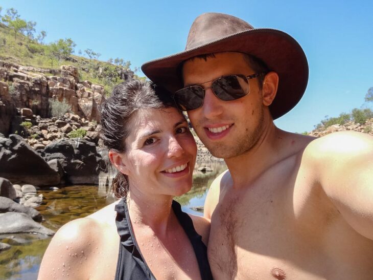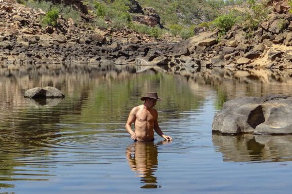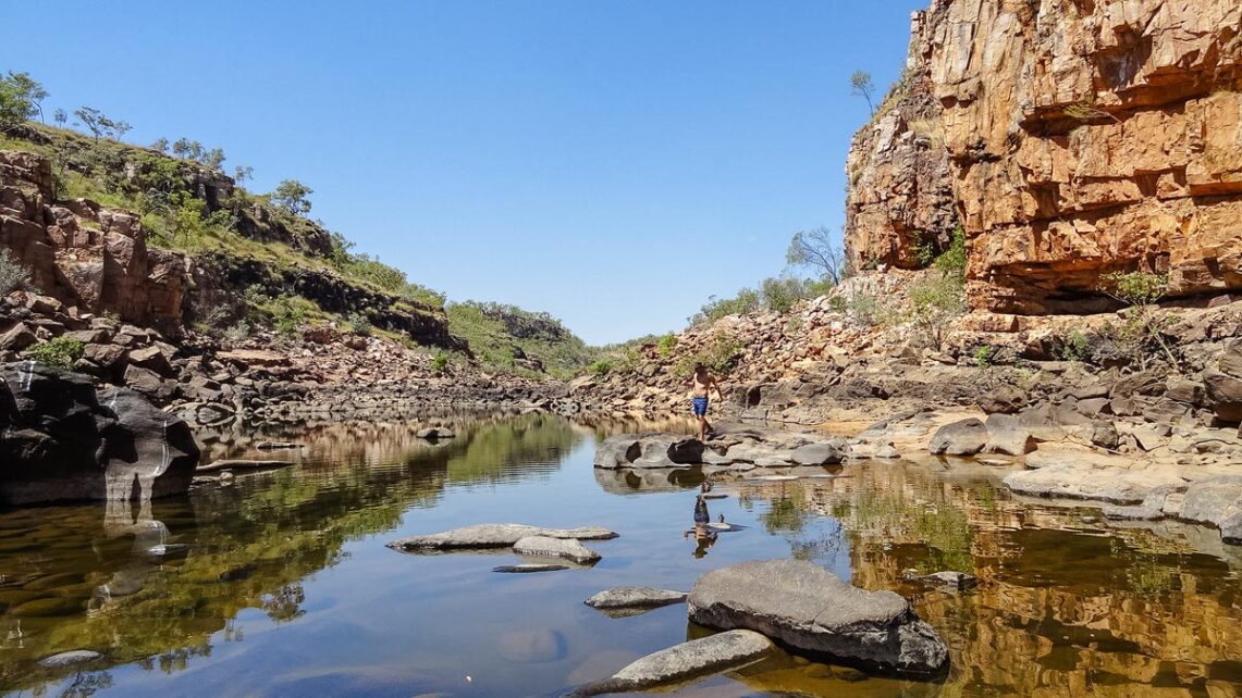 Aber vorher erfahren wir noch, dass es im Wasser der Felsschluchten Krokodile gibt. Na, das kann ja heiter werden. Allerdings handelt es sich bei den Krokodilen um Süßwasserkrokodile, in Australien auch als Freshies bekannt. Diese sind für den Menschen in der Regel harmlos und brüten in den Flussbänken. In der Wet Season, der Regenzeit, verirren sich aber auch gelegentlich Salzwasserkrokodile hierher, die Salties. Diese sind für den Menschen sehr wohl gefährlich und das Schwimmen ist in der Wet Sesaon daher verboten.