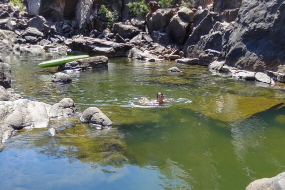 Am Ende des zweiten Gorges wird das Wasser flach. So flach, dass wir aussteigen und zum Ufer waten. Wir ziehen die Kajaks an Land und werfen uns ins kühle Wasser. Unser kleines Bad ist erfrischend, wir bekommen richtig Gänsehaut. Nur rauskommen dürfen wir heute nicht mehr, ansonsten hat uns die erbarmungslose Sonne gleich wieder.