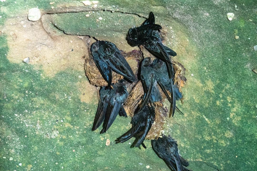 Schlafende Glanzkopfsalangane (Glossy Swiftlets) in ihren Nestern an einem Felsüberhang