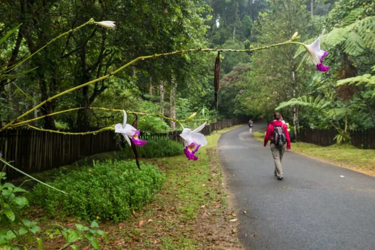 Es geht vorbei an kleinen, tropischen Gärten und schmalen Pfaden, die Besucher entlanglaufen können. Viele sind allerdings geschlossen. Was nicht weiter tragisch ist, wir haben eh nicht genug Zeit dafür, denn wir wollen schließlich pünktlich um 9 Uhr an der Fütterungsstation sein. Was uns genau erwartet, wissen wir nicht. Wir haben gelesen, dass es Plattformen im Wald gibt, zu denen die großen Affen kommen. Unsere Vorstellung ist, dass die Orang-Utans so weit weg sein werden, dass wir sie vermutlich kaum sehen können. Na mal abwarten …