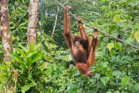 Im Park sind lange Seile zwischen den Bäumen gespannt, um den Orang-Utans das Hin- und Herklettern zu erleichtern. Und das tun die beiden auch. Der Pfleger erklärt uns, dass wir zwei junge Männchen vor uns haben. Er meint, dass wir heute sehr viel Glück hätten. Da Regenzeit ist, finden die Orang-Utans meist genug zu fressen im Wald und haben sich die letzten Tage nicht blicken lassen. Ein Grund mehr für uns zur Freude. Nach kurzer Zeit haben sich die zwei Junggesellen satt gefressen und klettern immer höher in die Bäume, bis sie schließlich im Wald verschwinden.