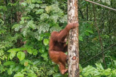 Trotzdem startet er noch einen letzten Versuch. Und tatsächlich! Hinten im Wald taucht ein kleiner, rotbrauner Kopf auf. Ein Orang-Utan-Junges. Dicht gefolgt von seiner Mutter. Alle sind mucksmäuschenstill und schauen gebannt auf den kleinen Affen, der sich die Seile entlang Richtung Plattform hangelt. Orang-Utan-Jungtiere sind heller als die Erwachsenen, aber ebenso geschickt. Dieses hier ist vier Jahre alt, ein Mädchen und heißt Ruby.