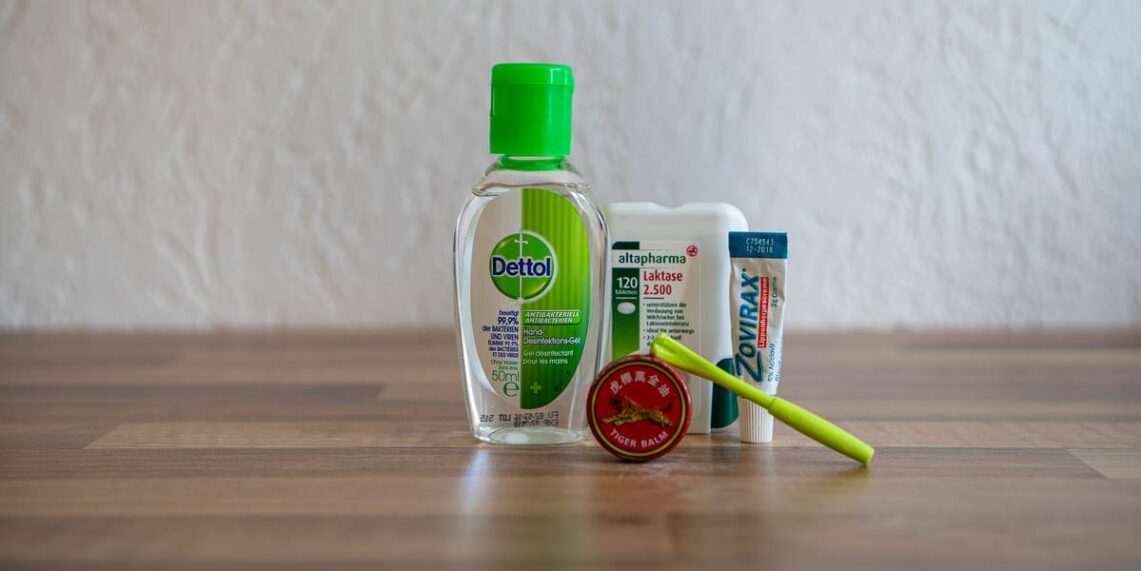 - Handdesinfektion, Tiger Balm, Zeckenhaken, Laktase und Herpescreme