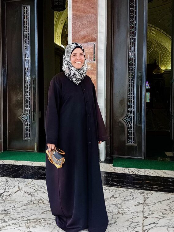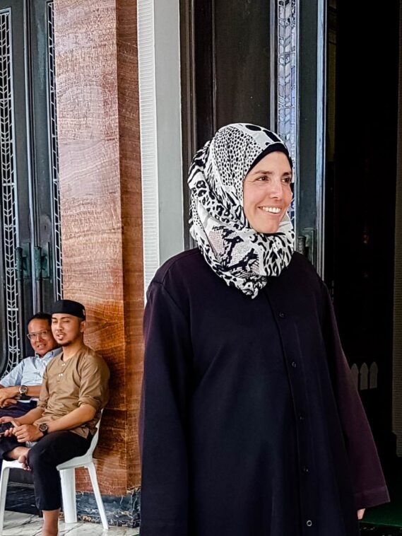 Steffen befestigt nur die langen Hosenbeine an seiner noch kurzen Wanderhose* und ist schon fertig. Wir gehen zum Eingang der Moschee, an dem bereits drei Männer sitzen und uns zugesehen haben. Wir ziehen die Schuhe aus und trotz langer Anziehsachen, muss ich noch eine schwarze Abaya überziehen, eine Art Kaftan, die Frauen über ihrer Kleidung tragen. Okay, meine ist zu groß und ich fühle mich wie ein Sack Kartoffeln. Aber wenigstens geht meine Kopfbedeckung klar und die Männer winken uns freundlich hinein.